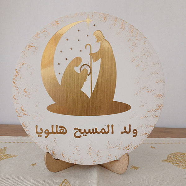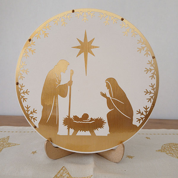 Celebrate the heart of Christmas with this elegant 19cm Nativity Scene Plaque, featuring a gold vinyl silhouette of Mary, Joseph, and baby Jesus beneath the Star of Bethlehem. The design is delicately applied to a smooth white gypsum round, framed with golden snowflake accents and presented on a wooden stand for easy display.
